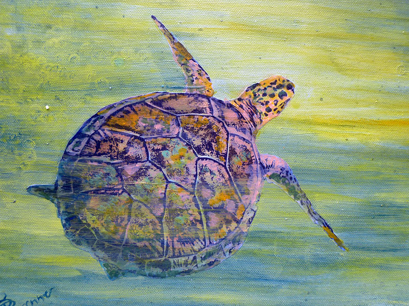 Das Bild besticht durch Glanzeffekte auf dem Ruecken der Schildkroete, den leichten Schimmer auf dem Wasser sowie das bunte und intensive Relief des Felsens.