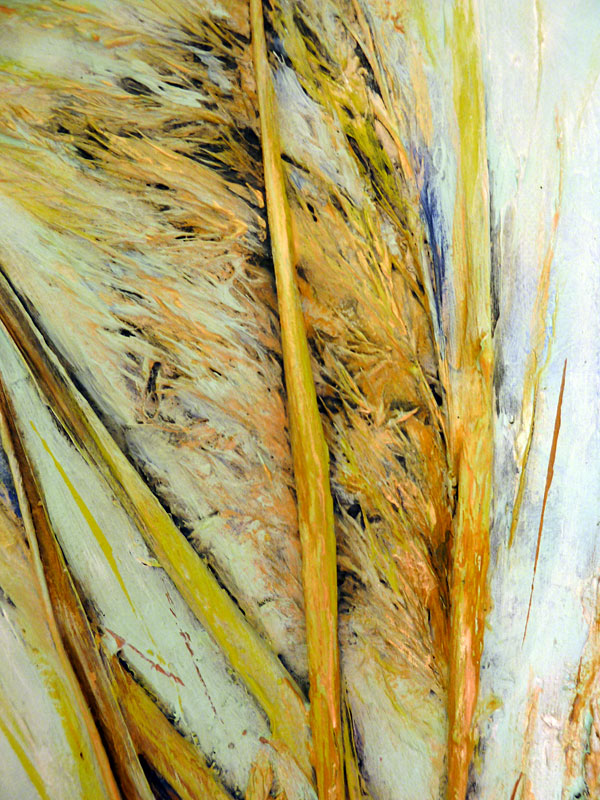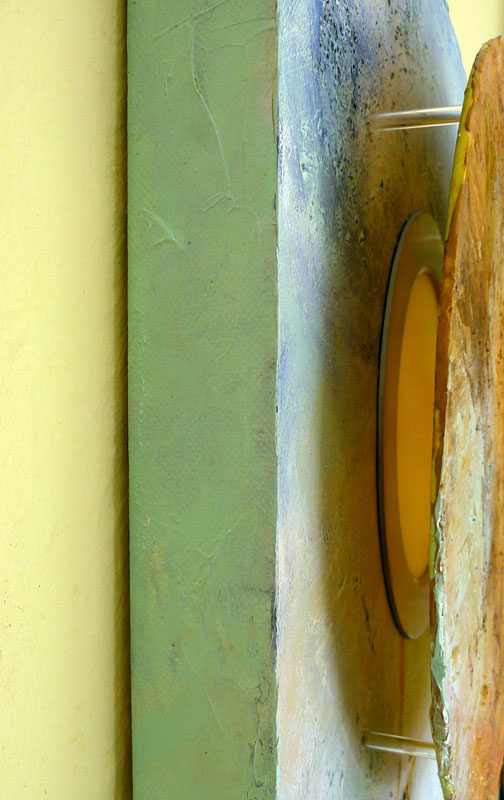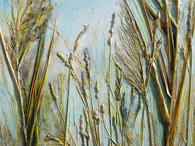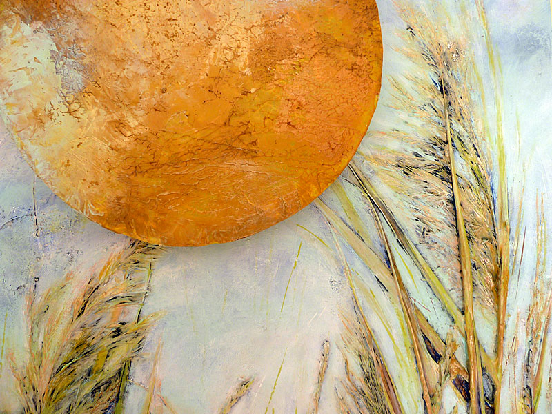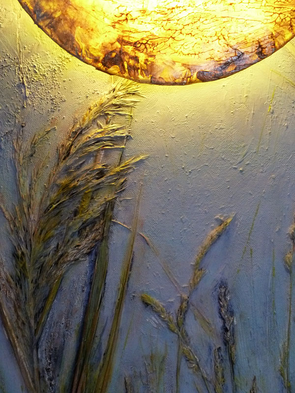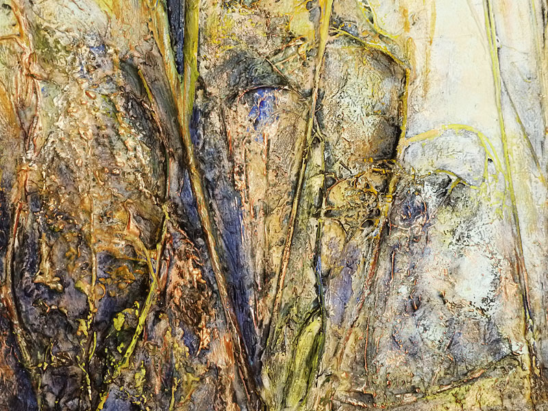 Acrylfarbe, Spachtelmasse, Binder, Strukturgele, Seidenpapier, verschiedene Naturmaterialien